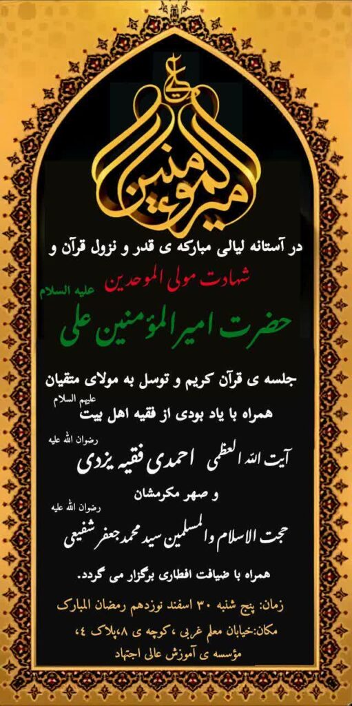 جلسه ی قرآن کریم و توسل به مولای متقیان همراه با یاد بودی از فقیه اهل بیت آیت الله العظمی احمدی فقیه و صهر مکرمشان حجت الاسلام و المسلمین سید محمد جعفر شفیعی